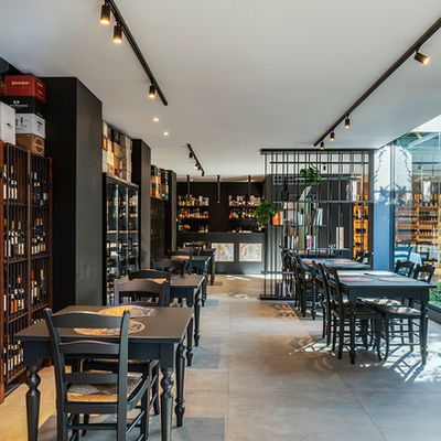 Il collegamento tra enoteca e ristorante è la grande vineria posta in continuità con la sequenza ingresso-patio; una grande esposizione di vini disposti su scaffali in rovere naturale che descrivono i tre lati dell'ambiente.