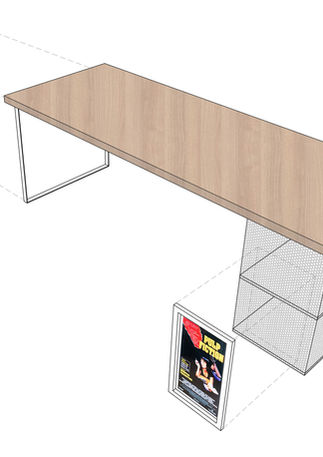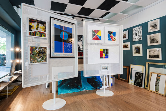 Lo spazio è progettato assecondando la sequenza che scandisce il processo: il cliente viene accolto attorno ad un tavolo, lungo quasi tre metri, abbastanza alto da poter essere utilizzato restando in piedi così da appoggiare il soggetto/oggetto da incorniciare e progettare la cornice con il Corniciaio.