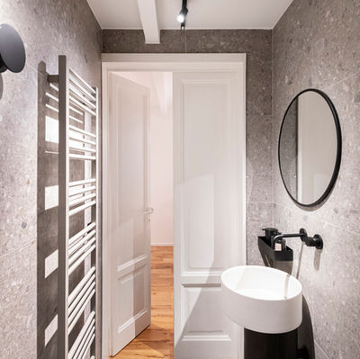 Una scelta stilistica rilevante è stata quella delle porte di distribuzione tra la zona giorno e la zona notte/bagno: invece di porte a battente o scorrevoli tradizionali, sono state utilizzate porte antiche di recupero, a due battenti. L’ispirazione e il richiamo alla distribuzione tipica delle case di inizio secolo dialogano con lo stile e i rimandi storici della casa e consentono una gestione ottimale delle relazioni tra gli ambienti: l’utilizzo comodo tramite l’apertura di un solo battente consente una minore invadenza degli spazi, rispetto ad una porta a singolo battente; al contrario, l’apertura a due battenti delle porte consente di avere aperture maggiori tra le stanze, configurando l’intero spazio dell’appartamento come fosse un unico open space.