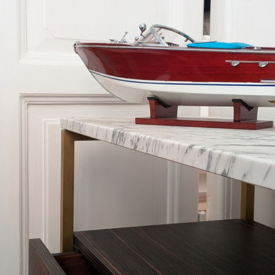 L’ importante studio delle finiture, dei dettagli e del disegno degli arredi, quasi tutti realizzati su misura, è volto alla massima valorizzazione e ottimizzazione dello spazio disponibile (pari a circa 40 mq).