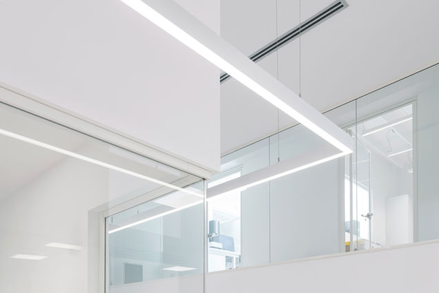 L’integrazione della luce artificiale diventa l’occasione per mettere l’accento sull’asse di distribuzione interna dei laboratori, sottolineato nel suo andamento da un lampadario a led customizzato, studiato per l’occasione e concepito per riflettere anch’esso il mood minimale dell’ambiente.