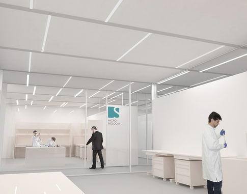 Il colore bianco (spezzato esclusivamente da note di dettaglio blu, il colore del brand aziendale) avvolge l’intero ambiente, riflesso della natura tecnica di questo, oltre che del rigore, della pulizia e dell’ordine che contraddistingue gli ambiti di laboratorio, e contribuisce al diffondersi della luce zenitale.